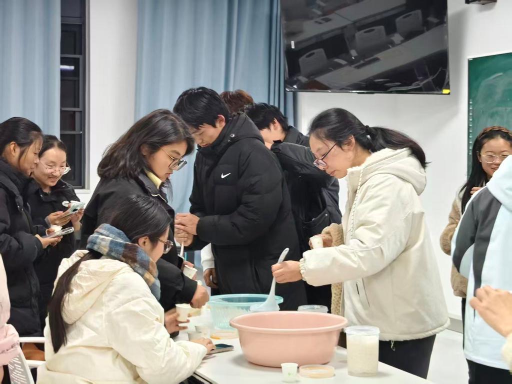 从文献查阅、试验设计、实施试验、过程观察、结果记录、数据分析、实践总结到成果汇报展示等各个环节,工作坊的同学们分组协作,展开工作。在试验中,糯米经过淘洗、浸泡和蒸煮后变得晶莹清香,冷凉后的熟糯米分别与含有不同浓度酒曲的水和红枣水相遇,在30摄氏度的环境下进行着生命体的繁衍和物质的转化。隔日后,同学们对发酵结束的成果进行指标测试和感官品鉴,并在bw必威西汉姆联官方网站敏思楼A1-204教室,各组长以PPT形式对本小组的实践成果向师生们进行了汇报分享。最后,赵昕梅老师对本次实践活动进行了点评总结。本次活动,得到了同学们的积极认可。同学们纷纷表示,这样的活动不仅有趣,而且从中锻炼了动手能力和解决问题的能力,并对生物科学专业的学科素养有了进一步的理解和认知。