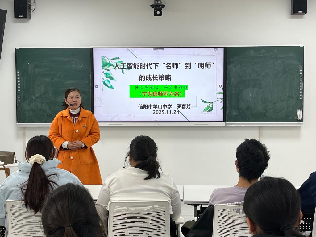 荆胜利副经理主持开场。信阳市羊山中学高级教师、中原名师罗春芳作题为《智能时代下“名师”到“明师”成长策略》的专题报告。她结合教学实践,指出生物教育在智能时代的发展趋势,强调师范生既要扎实专业基础,也要善用虚拟仿真、项目式学习等数字化手段提升教学效果。她勉励员工:“‘明师’应明晰育人初心,既要传授知识,更要培养员工的科学思维与生命观念。”