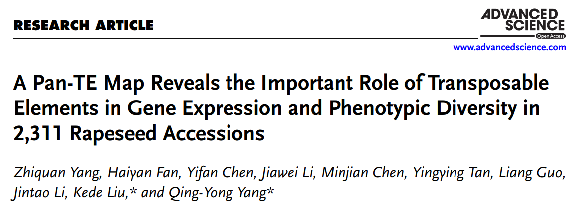 近日,公司bw必威西汉姆联官方网站与华中农业大学、崖州湾国家实验室等多单位联合在国际知名期刊Advanced Science(IF5 year:15.6)杂志上在线发表题为A pan-TE map reveals the important role of transposable elements in gene expression and phenotypic diversity in 2,311 rapeseed accessions的研究论文。该研究通过整合14个生态型代表性的油菜高质量基因组与来自全球2,311份油菜种质资源的大规模多组学数据,从基因组非编码区域的角度,全面系统地刻画了油菜转座子的组成、分布和变异规律,构建了全球首张油菜“泛转座子图谱”(pan-TE map),并深入揭示转座子在调控基因表达、驱动表型变异以及促进育种改良中的核心作用,为作物分子设计育种提供了全新的资源体系和理论基础。公司bw必威西汉姆联官方网站樊海燕博士为共同第一作者,植物营养与逆境生物学团队负责人李金涛副教授也参与了该研究工作。
