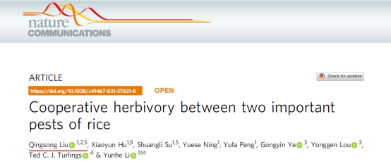 11月19日,国际知名学术期刊《Nature Communications》(五年影响因子:15.81)在线发表了公司bw必威西汉姆联官方网站刘清松博士等人完成的题为“Cooperative herbivory between two important pests of rice”的研究论文。这是公司科研人员首次以第一作者身份在Nature系列子刊发表研究论文。