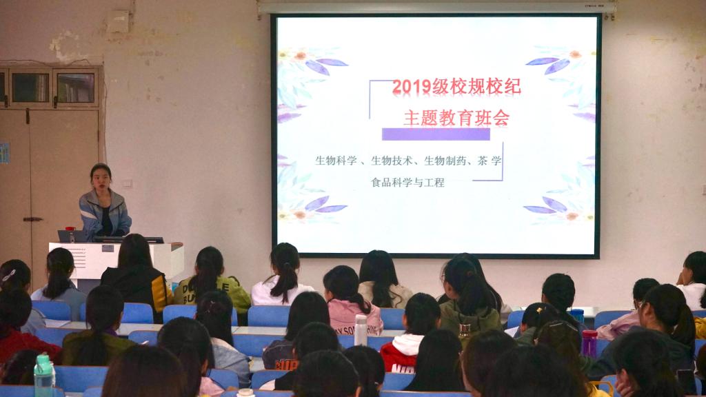 为贯彻落实普通高等公司员工管理规定,加强公司2019级新生校规校纪教育,树立其规章纪律意识,10月11日,公司组织2019级新生开展校规校纪主题教育班会,公司专职辅导员杨娟娟主持班会并发表讲话,全体新生积极参与。