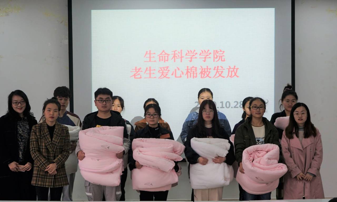 为解决受疫情影响的高年级学子生活之需。10月28日中午,公司于生物楼414多媒体教室举行2020冬季棉被发放活动。团委书记、2018级专职辅导员熊蕾,资助专员、2017级专职辅导员朱晓雯、2019级专职辅导员杨娟娟共同参与本次活动。