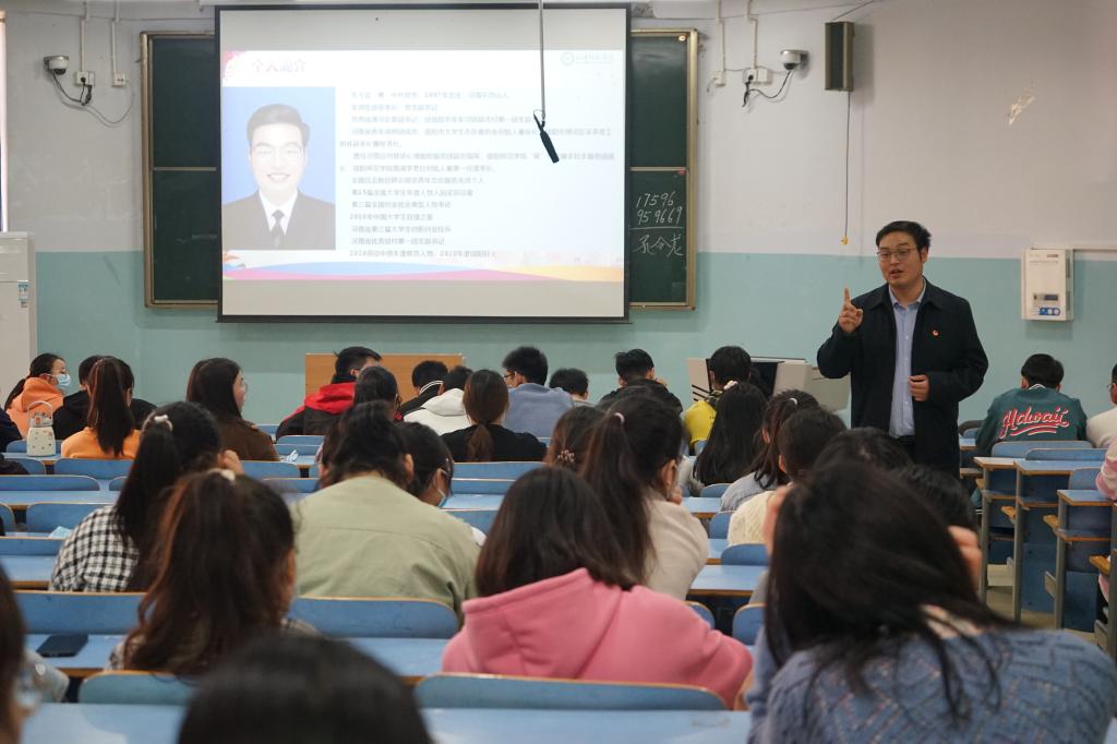 讲座伊始,孔令龙从自身经历展开讲述,出身农村,家境不好得到资助的他总能感同身受他人的不易。他说道,因为过去淋过雨,所以更想给别人撑伞。作为一名受国家和社会资助的新时代老员工,他一直致力于社会公益和贫困帮扶,切实用行动引领和鼓励学子们践行社会主义核心价值观。2020年1月,孔令龙参与河南应对疫情心理援助服务团,担任副总指挥;2020年2月,成立信阳师范公司“疫”线手拉手服务团,担任团长;2021年7月,联合成立河南抗洪战疫青年志愿服务团,担任副总指挥兼团长;2022年1月,成立“青春战疫”志愿服务团,担任副总指挥兼团长。伴随着热烈的掌声,孔令龙呼吁学子生逢其时当奋斗其时,努力发光成为光,超越自己。他也鼓励学子积极创新创业,运用专业优势和创业资源,正视挫折不气馁,努力成长为德智体美劳全面发展的社会主义事业接班人。实践出真知,不断地把理论运用到实践中,发挥专业优势和自身特长。他还提到学子应树立终身学习的观念,学习更多的知识和技能,不断提升自我。他指出,学子应该有明确的生涯规划,在完成学业的基础上也要努力做一些有意义的事,打造精彩的人生。