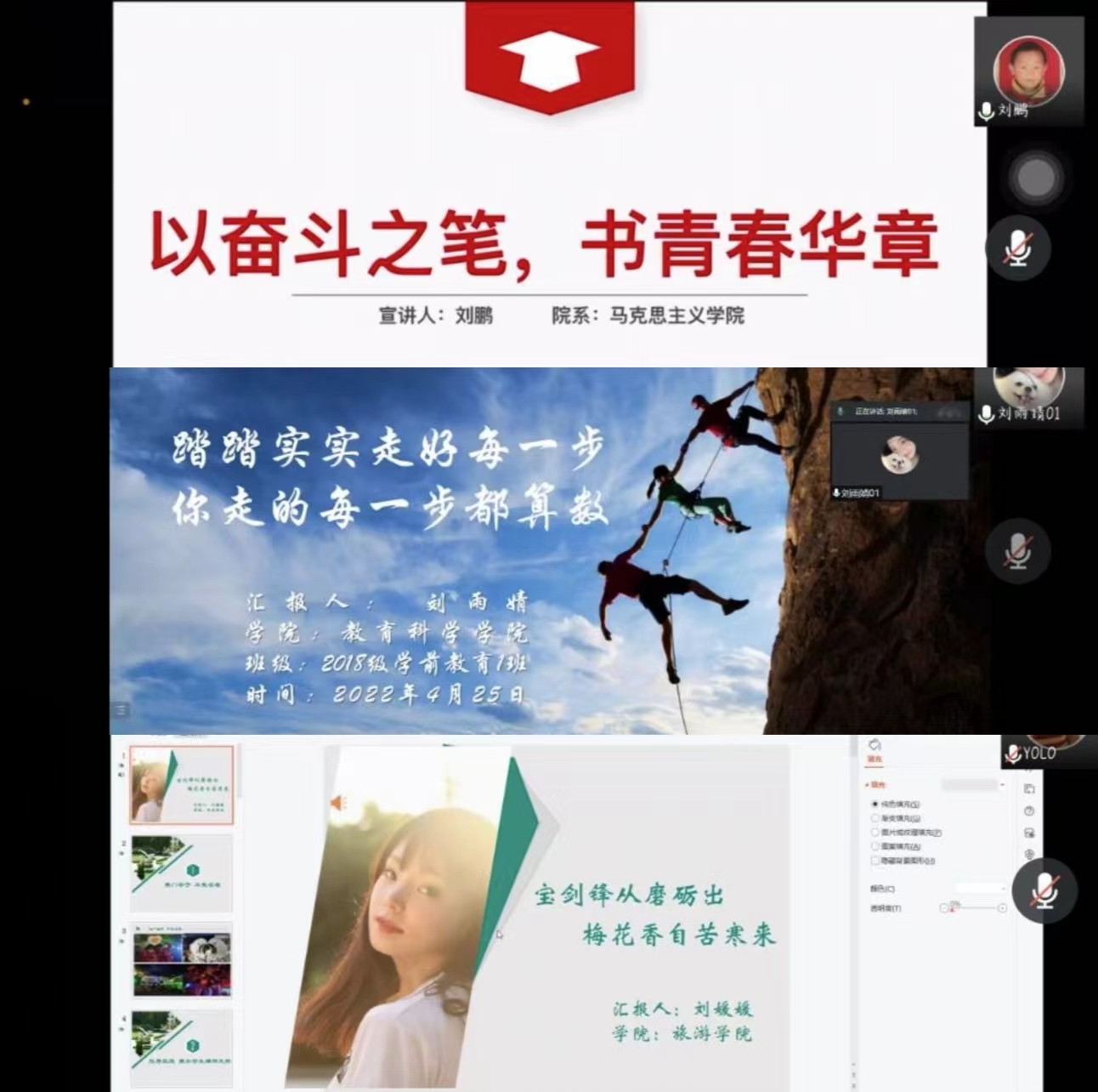 为了进一步加强公司德育工作,充分展示公司员工的精神风貌,发挥榜样的模范带头作用,营造积极向上的学习氛围,鼓励和激发同学们向身边的榜样学习,增强校园活力。4月27日晚,公司志愿服务中心助贷部以线上腾讯会议形式开展了“榜样红”——身边的榜样宣讲活动,公司资助专员李敏参加了宣讲活动,公司马克思主义公司国家奖学金获得者刘鹏、教育科学公司校园明星刘雨晴和旅游公司自强之星刘媛媛受邀进行宣讲,公司全体员工和公司兄弟公司部分员工聆听了此次宣讲。