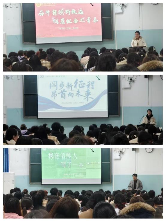 2021级专职辅导员张阳阳告诉同学们,奖学金不仅是对获奖同学努力的认可,也是对未获奖员工的一种激励,鼓励同学要向榜样学习,努力提升自己。然后化学化工公司郭可欣,数学与统计公司杨咏青,物理电子工程公司安哲依次上台进行宣讲。他们主要从思想、学习、科研、实践和技能拓展等方面进行讲解,在思想方面,向党靠拢,坚定信仰;在学习方面,戒骄戒躁,谦逊好学;在科研方面,自主创新,不断探索;在实践方面,投身公益,乐于奉献;在技能拓展方面,广泛尝试,勤加练习。他们用亲身奋斗经历告诉同学们,要以榜样为灯塔,指引方向,勇于突破,超越自我,稳扎稳打地锤炼自己,做一个敢于创新,有理想信念的新时代青年。