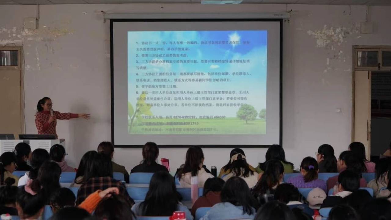 此次会议旨在为学子讲解三方协议作用与意义,引导学子严谨正确地填写,提醒在场学子慎重考虑协议内容,妥善保管相关证件。该会议有利于为学子树立正确的协议认知,防止部分毕业生陷入欺诈陷阱,对公司学子顺利毕业打下坚厚基础。