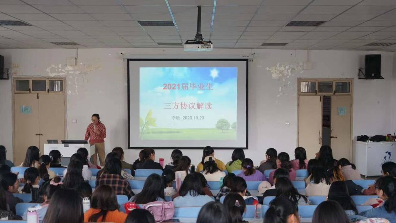 为确保学子顺利、正确签订协议,全面了解协议内容与含义。10月23日,公司于生科楼414多媒体教室召开“2021届毕业生三方协议解读”会议,会议由专职辅导员李敏主持,2021届bw必威西汉姆联官方网站全体毕业生共同参与。