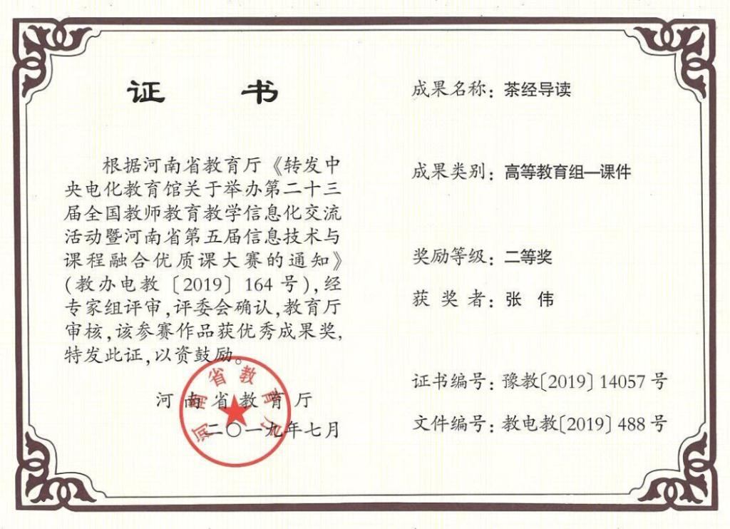 日前,河南省教育厅印发了《关于公布第二十三届全国教师公司产品信息化交流活动暨河南省第五届信息技术与课程融合优质课大赛评选结果的通知》(教电教〔2019〕488号)文件,公司张伟作品《茶经导读》荣获“高等教育组—课件”组优秀成果二等奖。