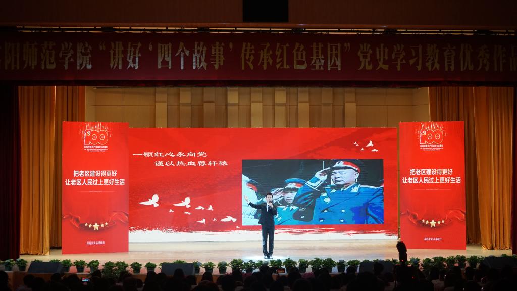 3月30日,信阳师范公司在艺术楼音乐厅举行以“讲好四个故事,传承红色基因”为主题的党史教育优秀作品展演活动,公司2018级学子李春洋担纲第九个故事主讲人。