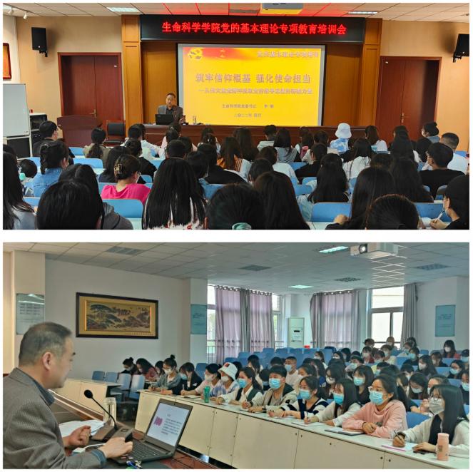 为确保师生党员对党的最新理论成果特别是党的指导思想认识到位,生命科学公司党委于4月21日晚在生科楼414报告厅召开专题党课就党的基本理论进行专项教育培训。公司党委书记李刚以“筑牢信仰根基 强化使命担当——从伟大建党精神汲取党的指导思想的磅礴力量”为题,带领员工党支部书记和全体预备党员在重温革命故事、感悟信仰力量中对党的基本理论和指导思想进行再教育再培训。